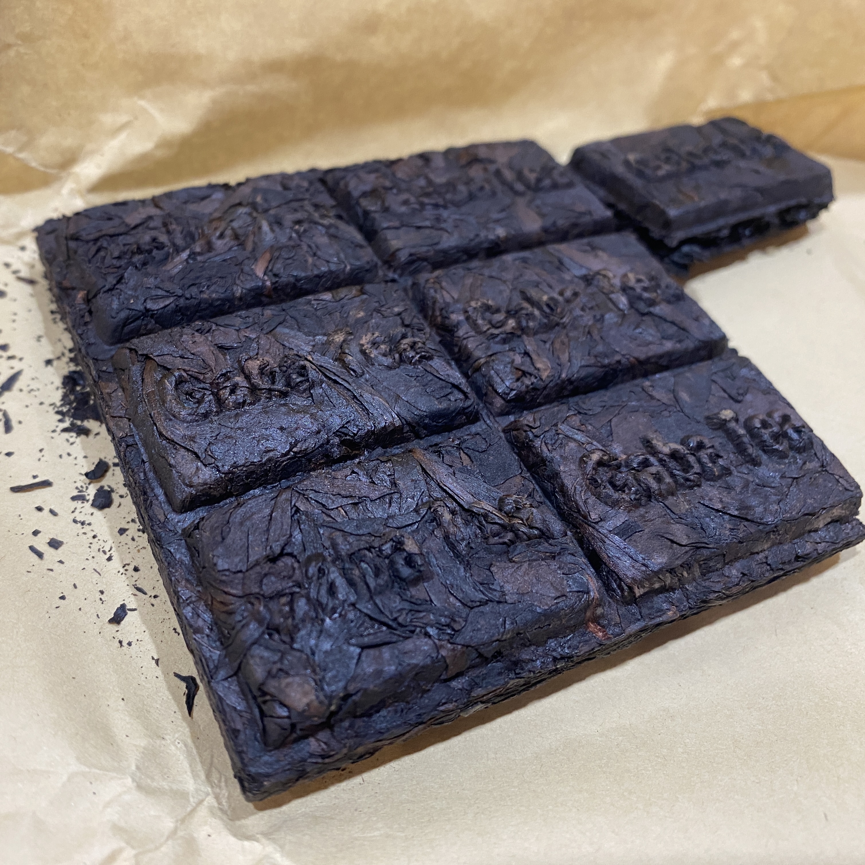 Прессованный в форму кирпича, но с разделением на плитки для удобного использования купаж листьев тёмного улуна крупного размера.